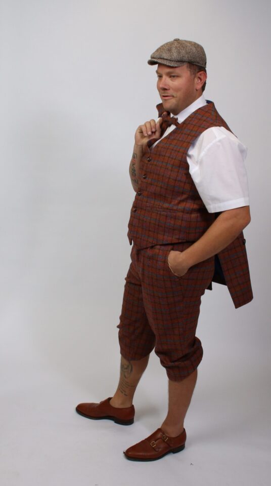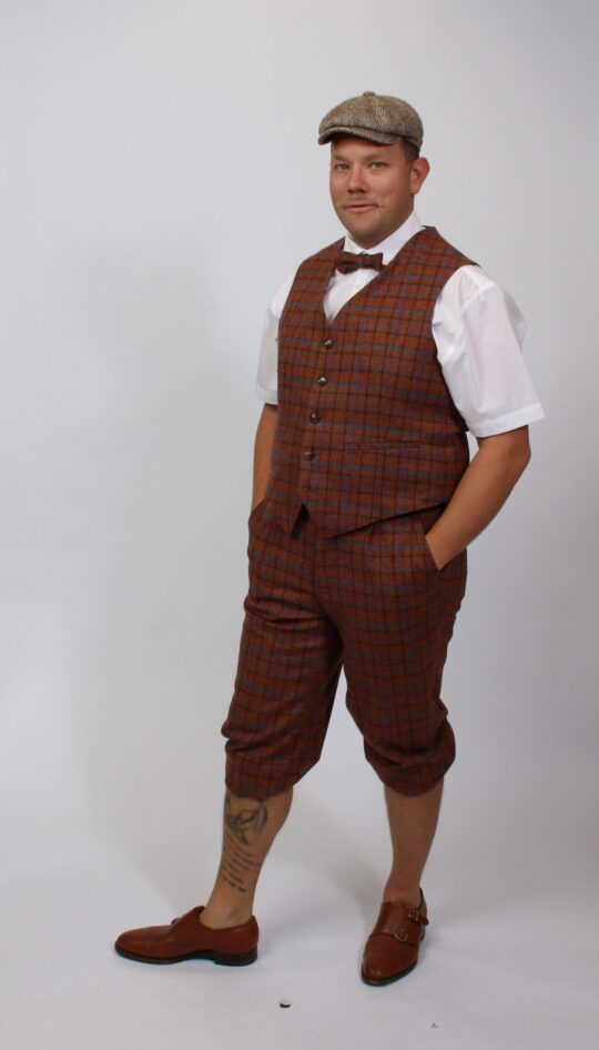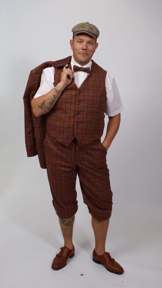 „20er/30er-Jahre Dreiteiler aus eigener Schneiderwerkstatt: Professionell geschneiderter Herrenanzug aus kariertem Schurwollstoff in Orange, Blau und Braun. Zweireihiges Sakko, einreihige Weste, Kniebundhose, passende Fliege, weißes Hemd, Hosenträger und braune Fischgrat-Schiebermütze – eleganter Vintage-Style mit handwerklicher Qualität.“