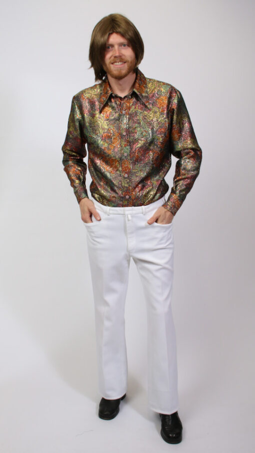 70er Jahre Outfit – Bunt, bestehend aus einem bunten, schillernden Hemd, einer weißen Schlaghose, einer Peacekette und 70er Jahre Brille.