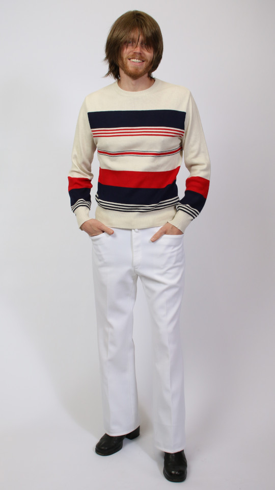 70er Jahre Outfit – Original – Gestreift, bestehend aus einem gestreiften Pullover, original aus den 70er Jahren, einer weißen Schlaghose, einer Peacekette und 70er Jahre Brille.