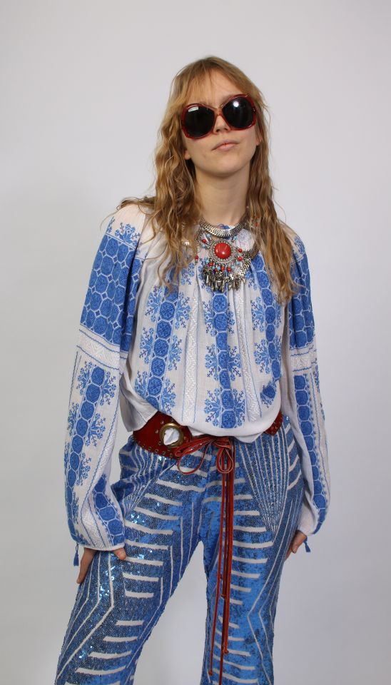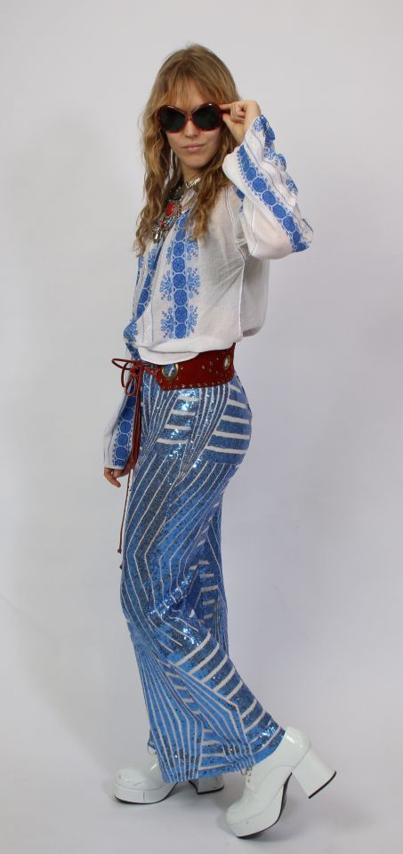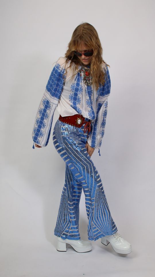 „Authentischer 70er-Jahre-Style: Weiß-blaue Folklorebluse trifft auf glitzernde Pailettenschlaghose und markanten rotem Ledermieder-Gürtel.“