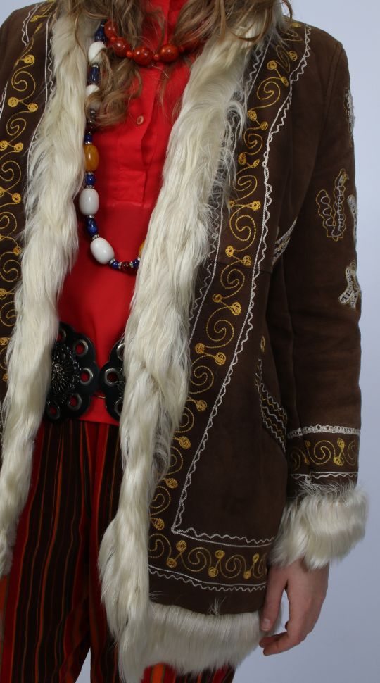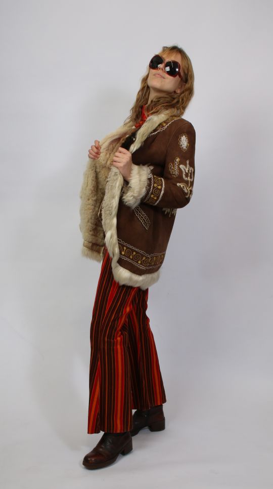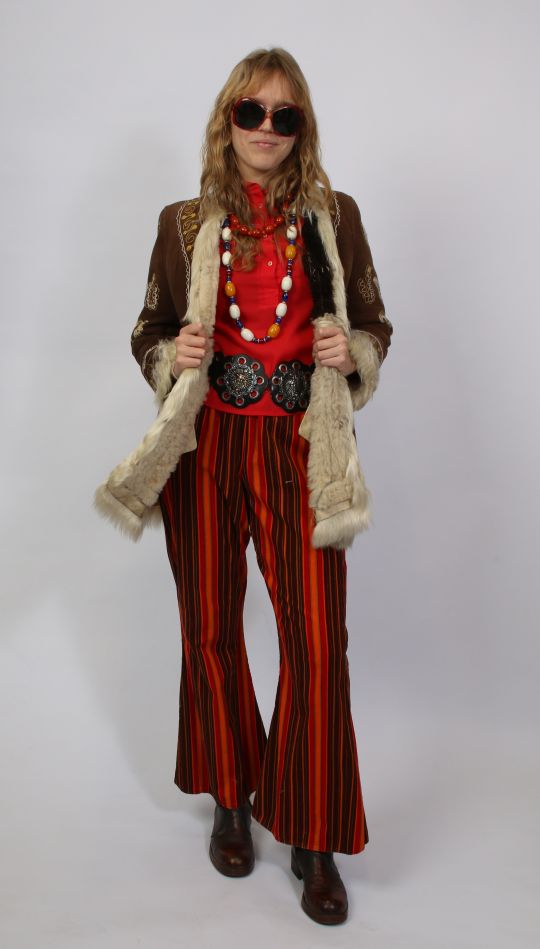 Schlaghose aus strukturiertem Cord, kombiniert mit einem roten Baumwollhemd mit spitzem 70er-Jahre-Kragen. Abgerundet wird der Look durch eine Jacke aus Originalfell, die dem Outfit einen markanten Vintage-Charakter verleiht.