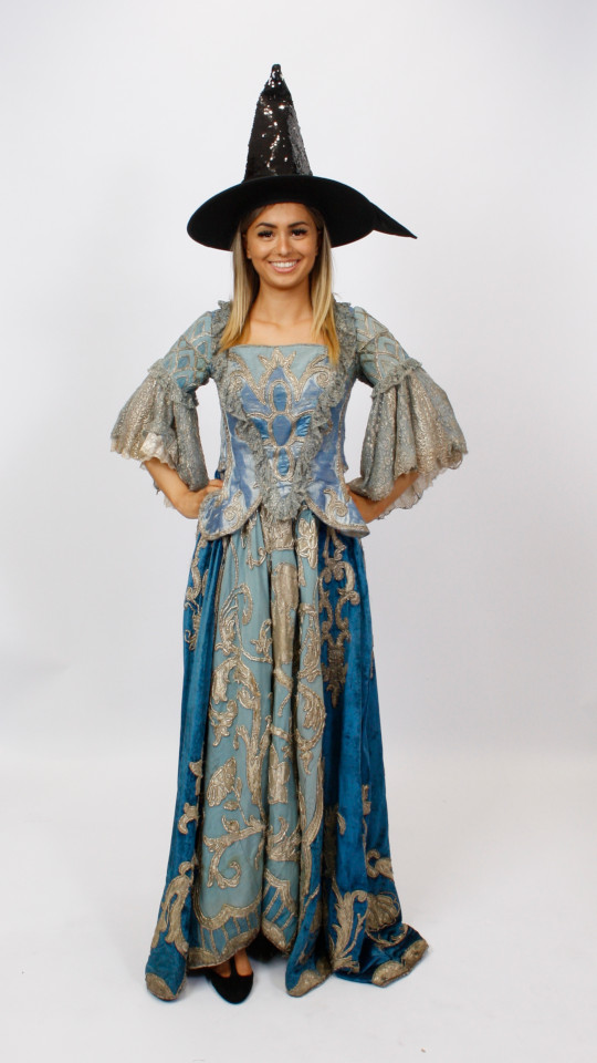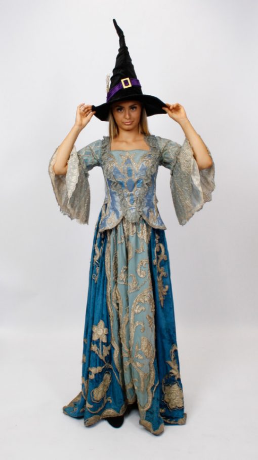 Halloween – Zauberin – Hexe Outfit, bestehend aus einem azurblauen Kleid mit Spitze und Stickereien und einem Hut.